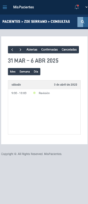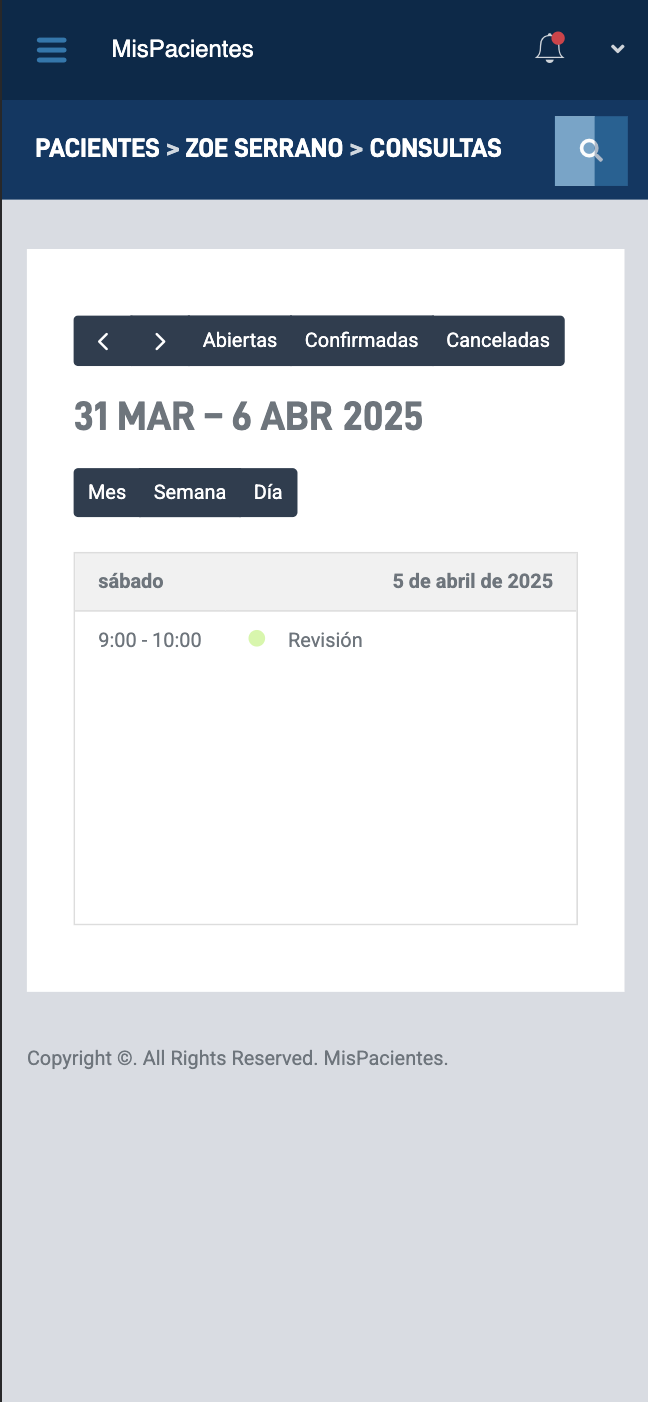 Organiza y visualiza las consultas en un calendario con opciones de vista por mes, semana o día. Además, podrás filtrar las consultas por estado: confirmadas, canceladas o abiertas.